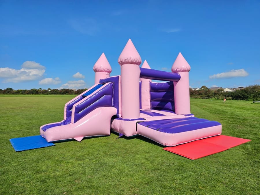 We are pleased to offer delivery of our Pink & Purple Bouncy Castle Combo DISCO COMPATIBLE to the following areas: Pembrokeshire, Haverfordwest, Pembroke, Pembroke Dock, Tenby, Milford Haven, Fishguard, St. Davids, Cardigan, Whitland, and Carmarthen.