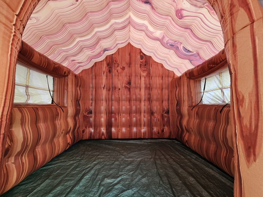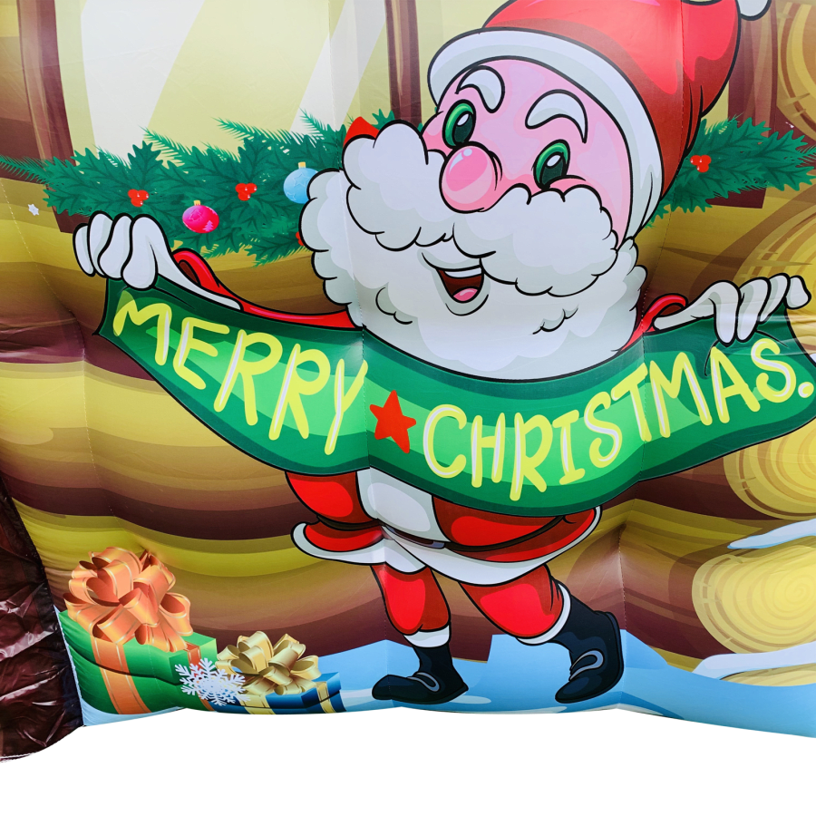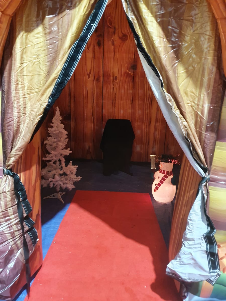 The Santa's Grotto has amazing artwork featuring Santa himself, A cheeky snowman, and decorated with festive holly, bells, and snowflakes. The grotto hire also features roll-up windows for privacy making it the ideal structure for any Santa's visits, giveaways or meet and greet events.