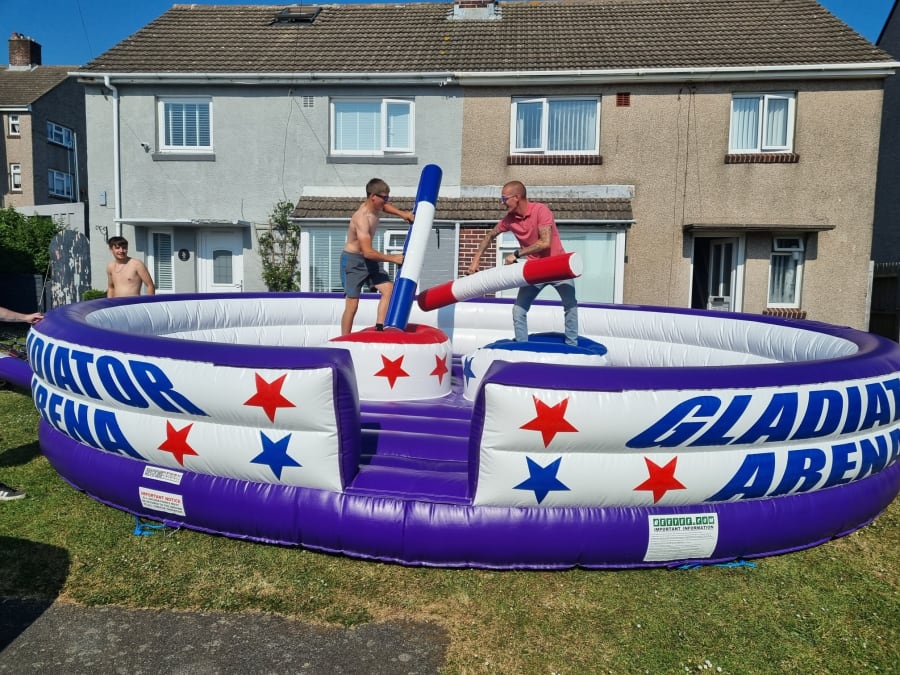 Transform your event into an epic battleground with our Gladiator Arena, available for hire in Pembrokeshire - Haverfordwest, Tenby, Milford Haven, Neyland, Dale, St.Davids, Fishguard, Narberth, or Pembroke. Perfect for team building events, festivals, opening days, corporate events, birthdays, and garden parties, this inflatable attraction guarantees high-energy fun and excitement for everyone involved!