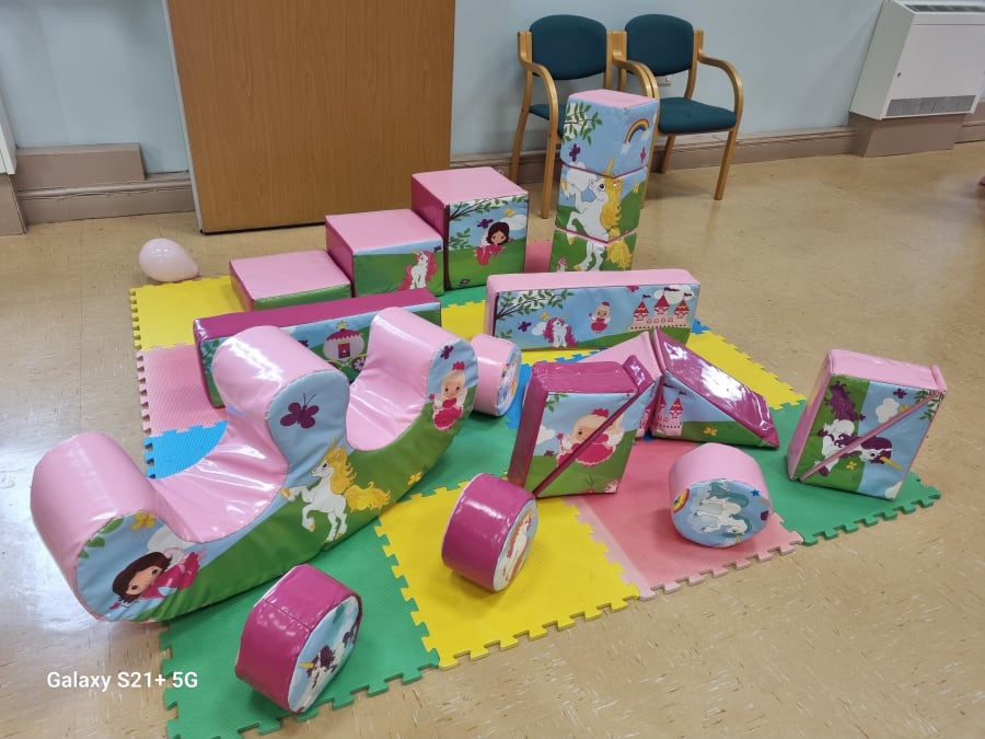 The soft play set up contains a variety of padded, foam shapes including pebbles, steps, triangles, rectangles and blocks and a rocker. Fantastic for young children and toddlers.